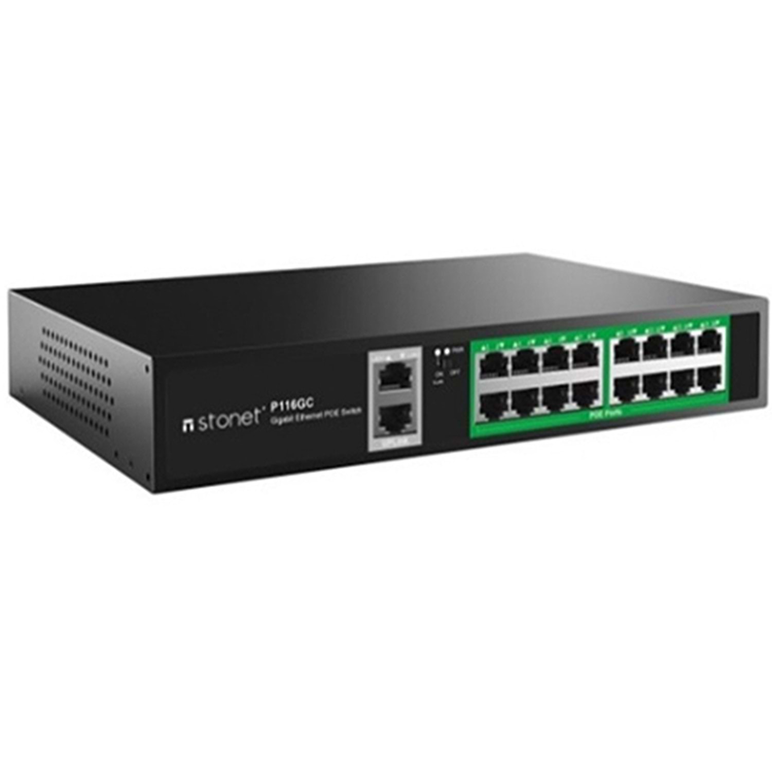 Stonet P116GC is a 18 Ports standard POE switch that provides 16 GE POE ports , 2 Gigabit Up-link ports. Ports 1~16 features POE power supply capability and can be used as Power over Ethernet devices. The power supply port can automatically detect and recognize the powered device that complies with the IEEE 802.3af/at standard and supply power through the network cable. 2 Gigabit uplink ports ensure a smooth transmission for NVR or up-link routers. P116GC is designed for HD CCTV network or high speed wireless network systems.