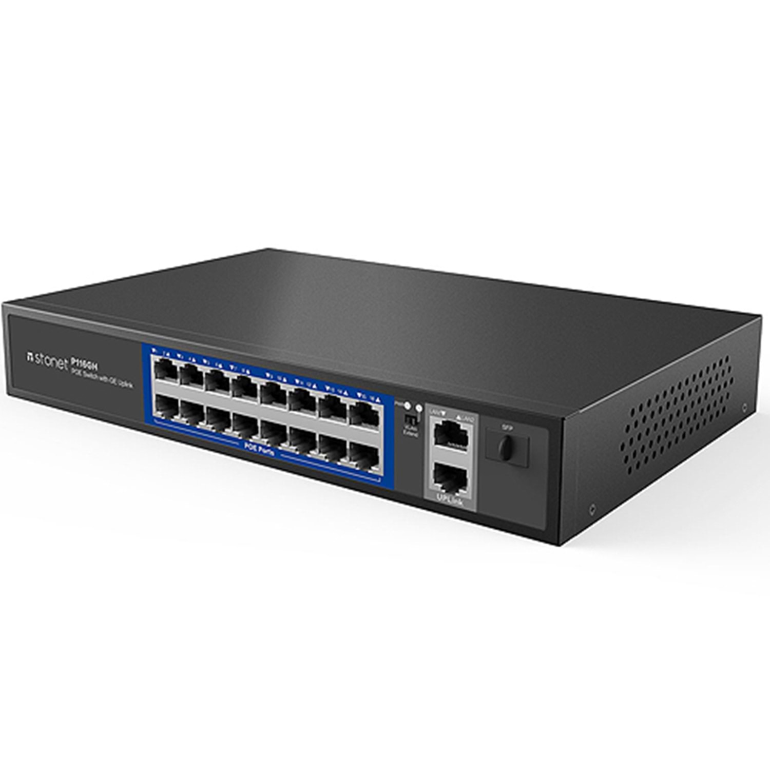 Stonet P116GH is a 18 Ports standard POE switch that provides 16 FE POE ports , 2 Gigabit Up-link ports and 1 SFP fiber port. Ports 1~16 features POE power supply capability and can be used as Power over Ethernet devices. The power supply port can automatically detect and recognize the powered device that complies with the IEEE 802.3af/at standard and supply power through the network cable. 2 Gigabit uplink ports ensure a smooth transmission for NVR or up-link routers. P116GH is a most economical solution for HD security network.
